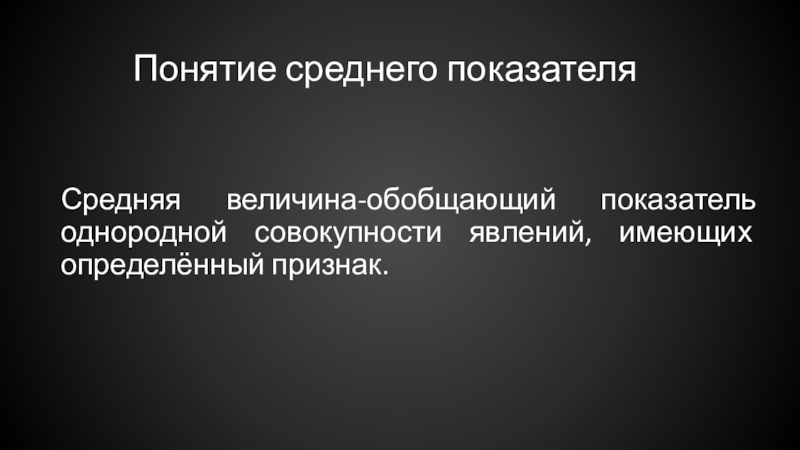 Понятие среднего показателяСредняя величина-обобщающий показатель однородной совокупности явлений, имеющих определённый признак.