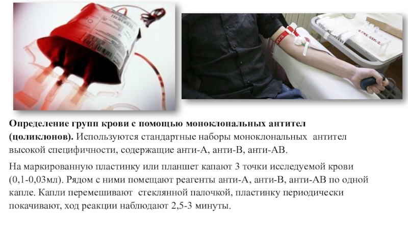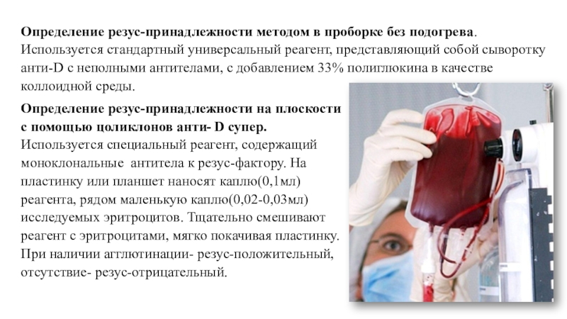 Определение резус-принадлежности на плоскости с помощью цоликлонов анти- D супер. Используется специальный реагент, содержащий моноклональные антитела к резус-фактору. На пластинку или планшет наносят каплю(0,1мл) реагента, рядом маленькую каплю(0,02-0,03мл) исследуемых эритроцитов. Тщательно смешивают реагент с эритроцитами, мягко покачивая пластинку. При наличии агглютинации- резус-положительный, отсутствие- резус-отрицательный.