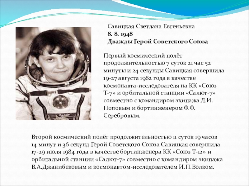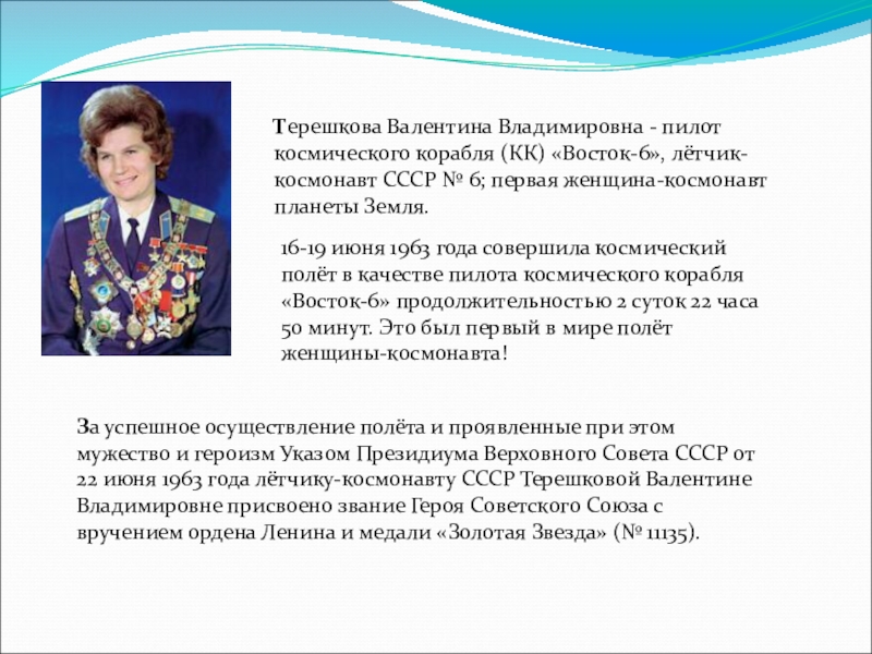 16-19 июня 1963 года совершила космический полёт в качестве пилота космического корабля «Восток-6» продолжительностью 2 суток 22 часа 50 минут. Это был первый в мире полёт женщины-космонавта!