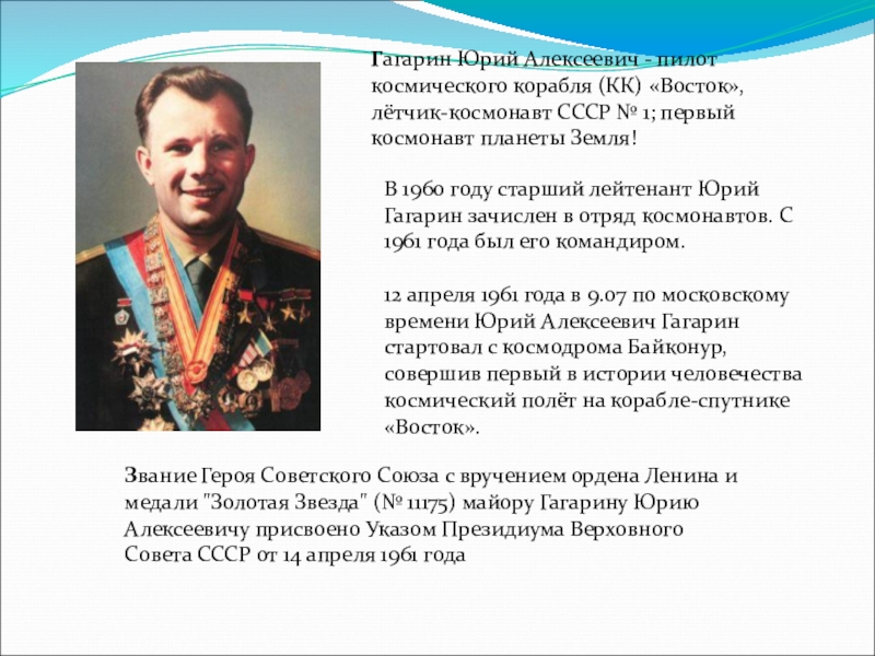 Звание Героя Советского Союза с вручением ордена Ленина и медали "Золотая Звезда" (№ 11175) майору Гагарину Юрию Алексеевичу присвоено Указом Президиума Верховного Совета СССР от 14 апреля 1961 года