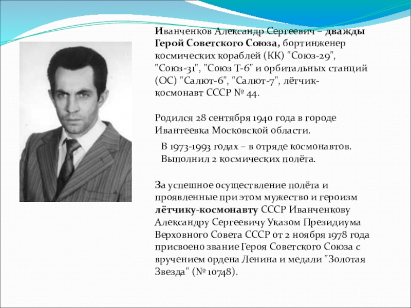 За успешное осуществление полёта и проявленные при этом мужество и героизм лётчику-космонавту СССР Иванченкову Александру Сергеевичу Указом Президиума Верховного Совета СССР от 2 ноября 1978 года присвоено звание Героя Советского Союза с вручением ордена Ленина и медали "Золотая Звезда" (№ 10748).