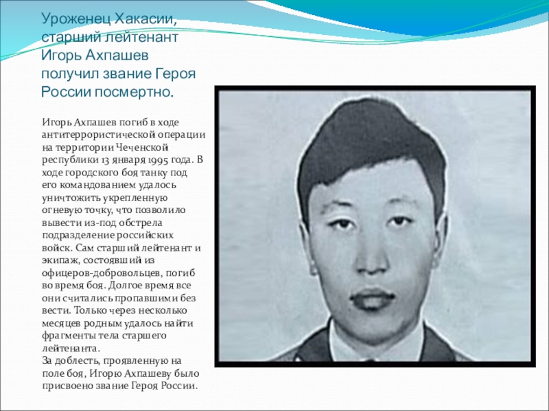 Младший сержант милиции Алексей Баженов героически погиб в 1996 году в Грозном. В составе сводного отряда бойцов ОМОН он обеспечивал коридор безопасности