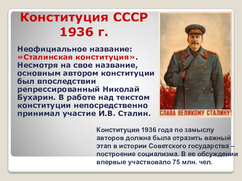 Конституция 1936 года по замыслу авторов должна была отразить важный этап в истории Советского государства – построение социализма. В ее обсуждении впервые участвовало 75 млн. чел.