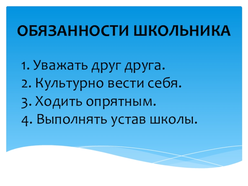 ОБЯЗАННОСТИ ШКОЛЬНИКА1. Уважать друг друга.2. Культурно вести себя.3. Ходить опрятным.4. Выполнять устав школы.