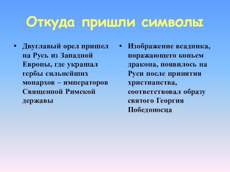 Изображение всадника, поражающего копьем дракона, появилось на Руси после принятия христианства, соответствовал образу святого Георгия Победоносца