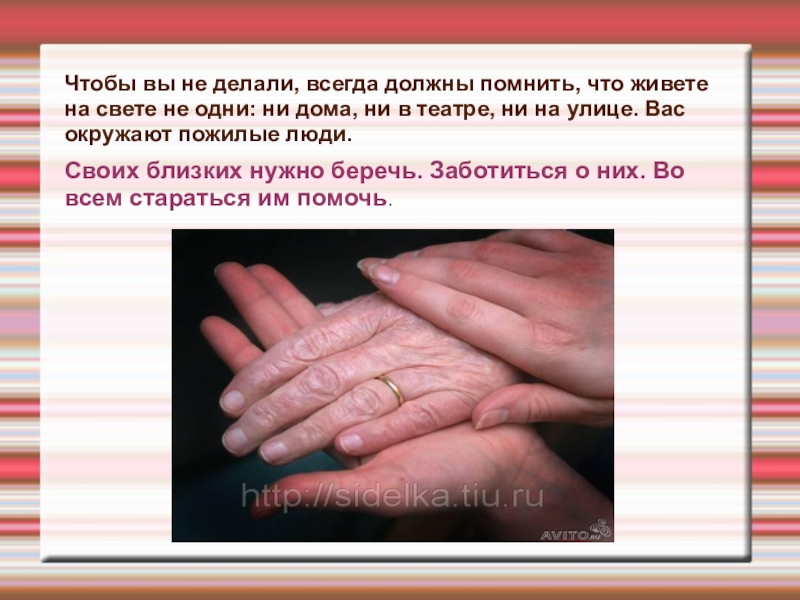 Своих близких нужно беречь. Заботиться о них. Во всем стараться им помочь.