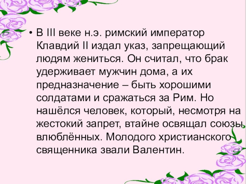 людям жениться. Он считал, что брак удерживает мужчин дома, а их предназначение – быть хорошими солдатами и сражаться за Рим. Но нашёлся человек, который, несмотря на жестокий запрет, втайне освящал союзы влюблённых. Молодого христианского священника звали Валентин.