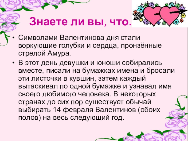 Символами Валентинова дня стали воркующие голубки и сердца,