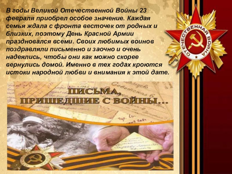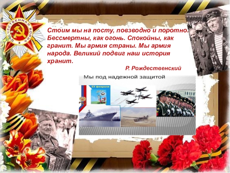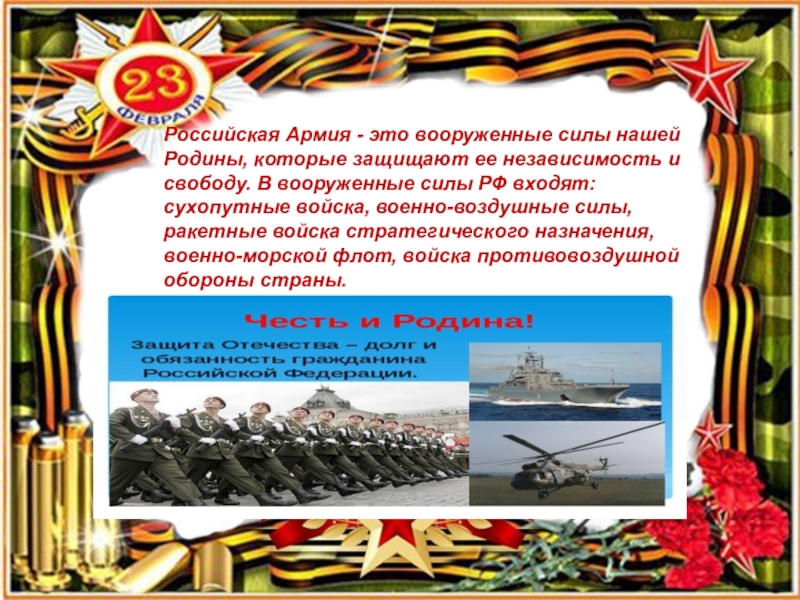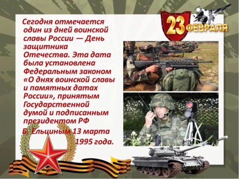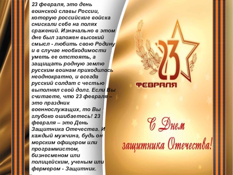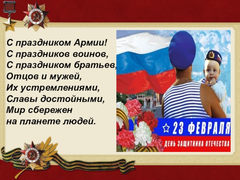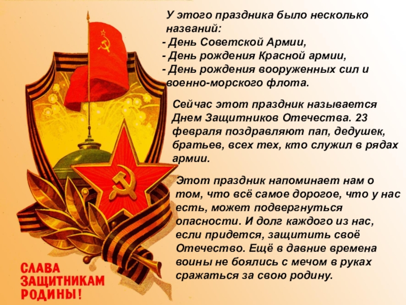 Сейчас этот праздник называется Днем Защитников Отечества. 23 февраля поздравляют пап, дедушек, братьев, всех тех, кто служил в рядах армии.