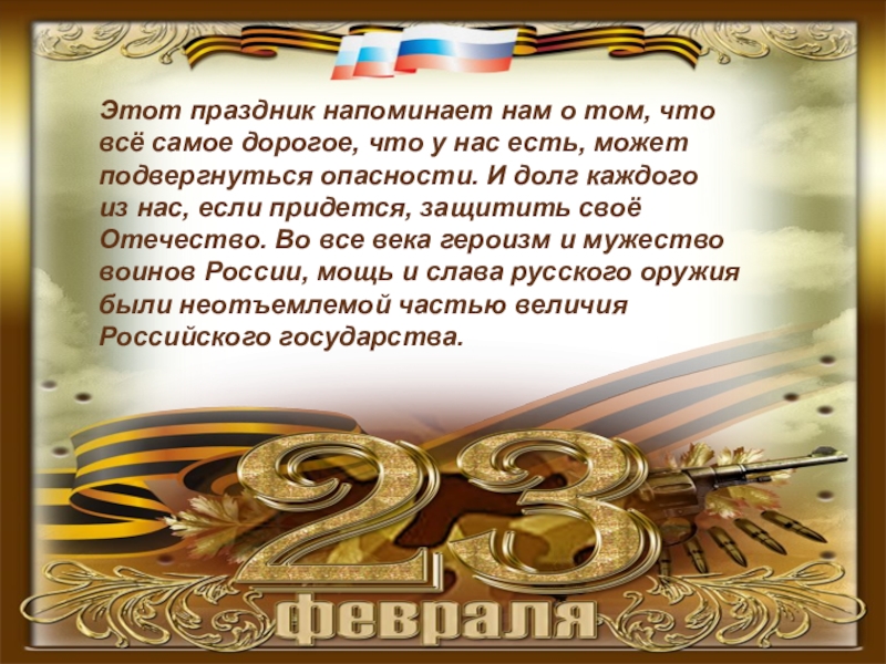Этот праздник напоминает нам о том, что всё самое дорогое, что у нас есть, может подвергнуться опасности. И долг каждого из нас, если придется, защитить своё Отечество. Ещё в давние времена воины не боялись с мечом в руках сражаться за свою родину.