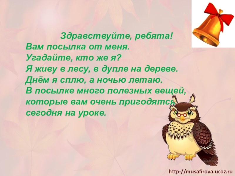 от меня. Угадайте, кто же я? Я живу в лесу, в дупле на дереве. Днём я сплю, а ночью летаю. В посылке много полезных вещей, которые вам очень пригодятся сегодня на уроке.