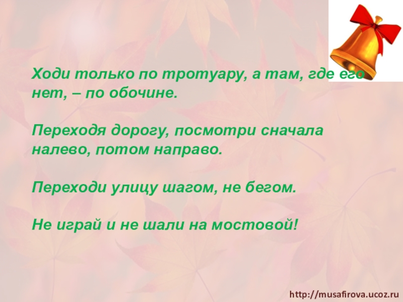 Ходи только по тротуару, а там, где его нет, – по обочине. Переходя дорогу, посмотри сначала налево, потом