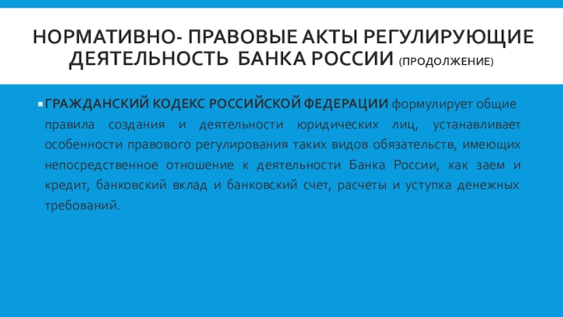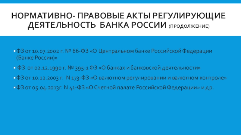 Слайд 13Нормативно- правовые акты регулирующие деятельность Банка России (продолжение)