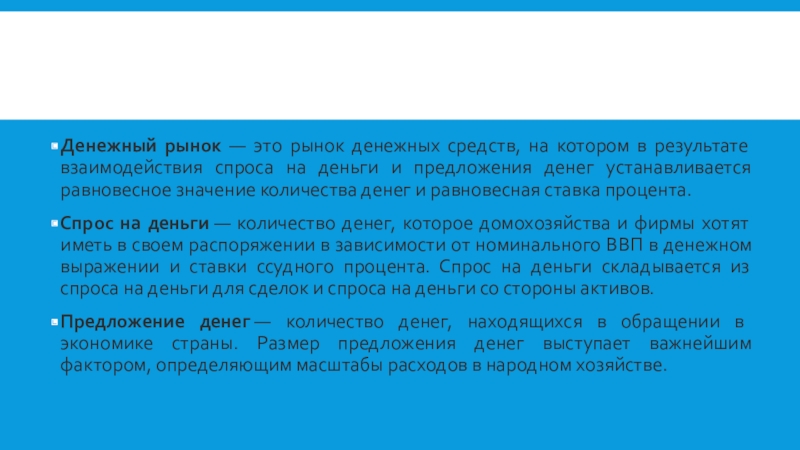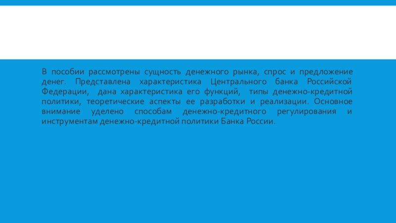 Слайд 4В пособии рассмотрены сущность денежного рынка, спрос и предложение денег. Представлена
