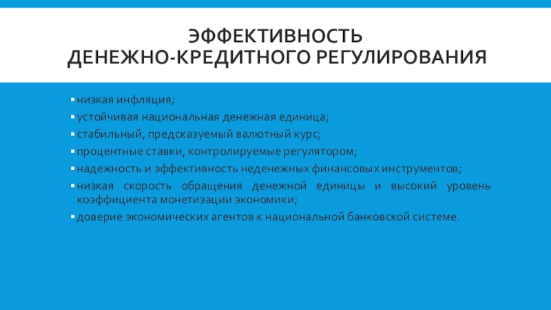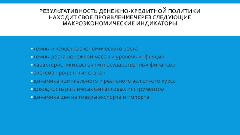 Слайд 40Результативность денежно-кредитной политики находит свое проявление через следующие макроэкономические индикаторы