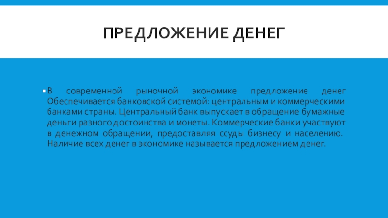 и коммерческими банками страны. Центральный банк выпускает в обращение бумажные деньги разного достоинства и монеты. Коммерческие банки участвуют в денежном обращении, предоставляя ссуды бизнесу и населению. Наличие всех денег в экономике называется предложением денег.