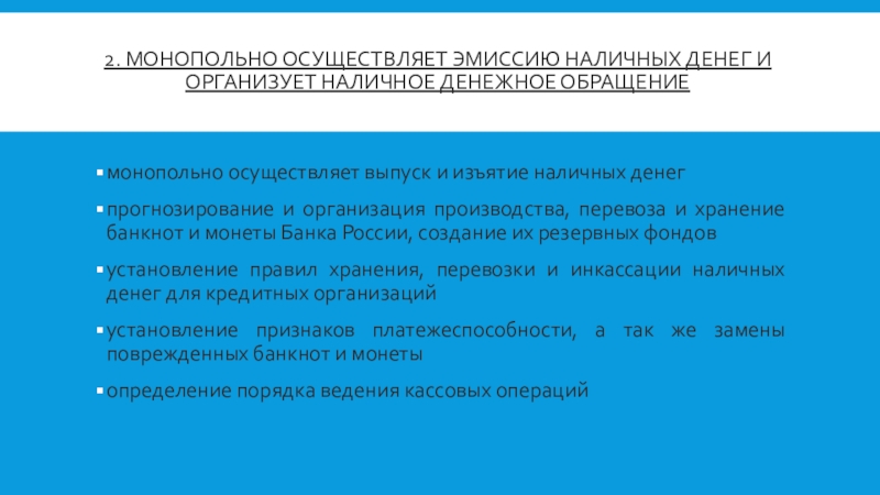2. Монопольно осуществляет эмиссию наличных денег и организует наличное денежное обращение