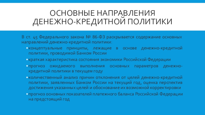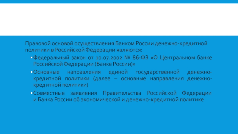 Слайд 45Правовой основой осуществления Банком России денежно-кредитной политики в Российской Федерации являются: