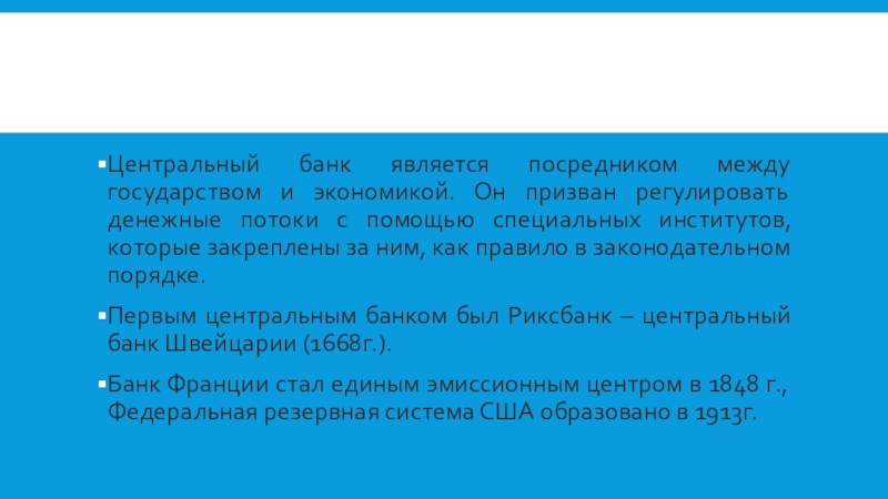 Первым центральным банком был Риксбанк – центральный банк Швейцарии (1668г.).