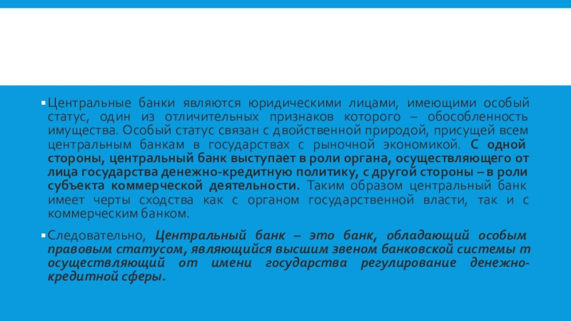 Слайд 9Центральные банки являются юридическими лицами, имеющими особый статус, один из отличительных