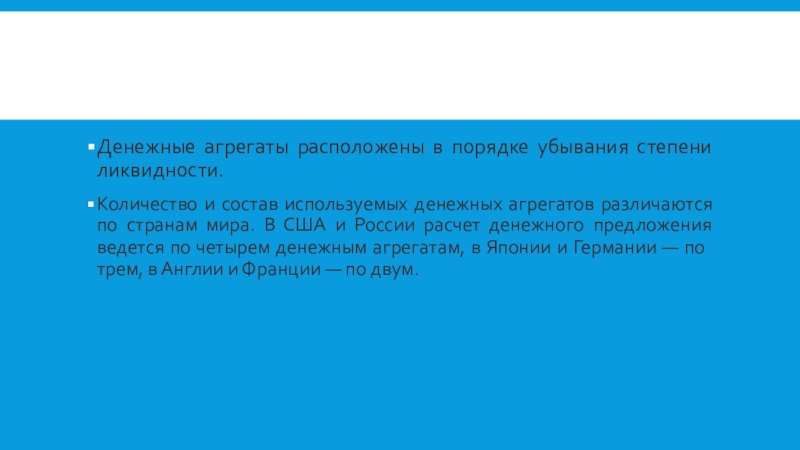 Слайд 35Денежные агрегаты расположены в порядке убывания степени ликвидности.