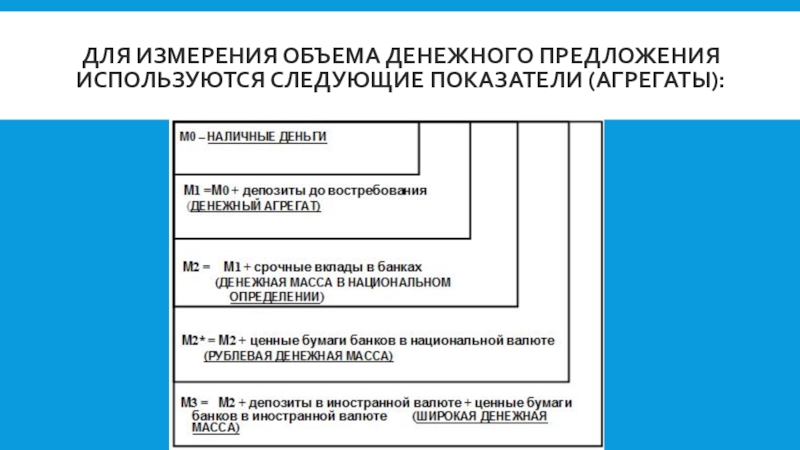 Для измерения объема денежного предложения используются следующие показатели (агрегаты):