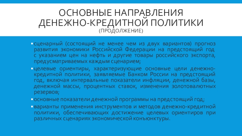 целевые ориентиры, характеризующие основные цели денежно-кредитной политики, заявляемые Банком России на предстоящий год, включая интервальные показатели инфляции, денежной базы, денежной массы, процентных ставок, изменения золотовалютных резервов;