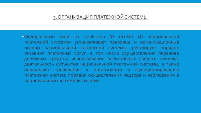национальной платежной системе» устанавливает правовые и организационные основы национальной платежной системы, регулирует порядок оказания платежных услуг, в том числе осуществления перевода денежных средств, использования электронных средств платежа, деятельность субъектов национальной платежной системы, а также определяет требования к организации и функционированию платежных систем, порядок осуществления надзора и наблюдения в национальной платежной системе