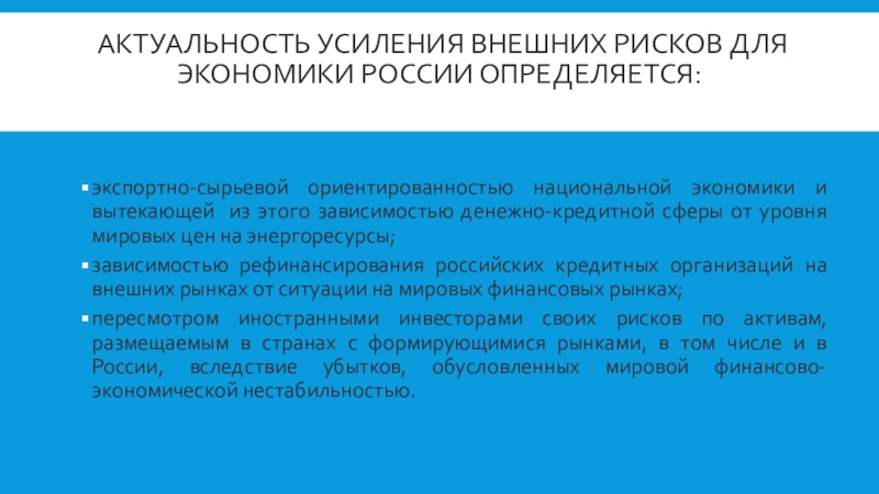 пересмотром иностранными инвесторами своих рисков по активам, размещаемым в странах с формирующимися рынками, в том числе и в России, вследствие убытков, обусловленных мировой финансово-экономической нестабильностью.