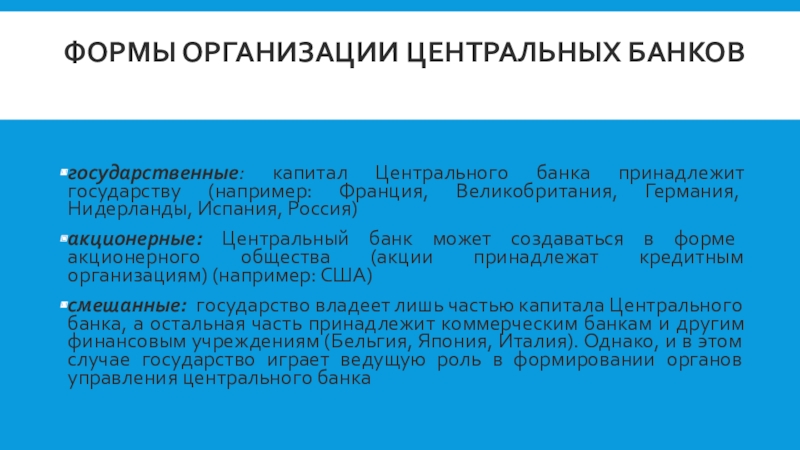 смешанные: государство владеет лишь частью капитала Центрального банка, а остальная часть принадлежит коммерческим банкам и другим финансовым учреждениям (Бельгия, Япония, Италия). Однако, и в этом случае государство играет ведущую роль в формировании органов управления центрального банка