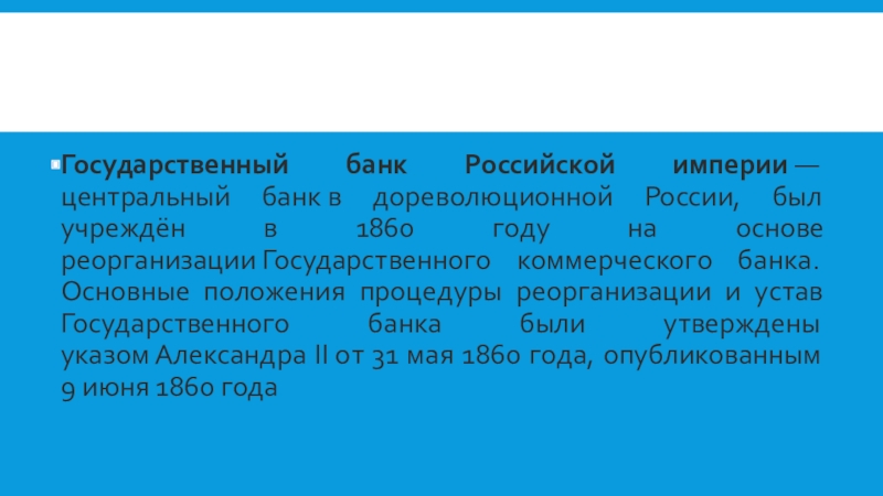 Слайд 8Государственный банк Российской империи —центральный банк в дореволюционной России, был учреждён в 1860