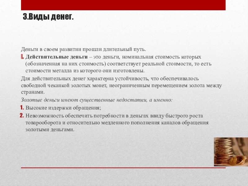 Для действительных денег характерна устойчивость, что обеспечивалось свободной чеканкой золотых монет, неограниченным перемещением золота между странами.