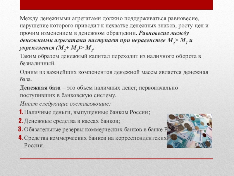 Слайд 16Между денежными агрегатами должно поддерживаться равновесие, нарушение которого приводит к нехватке