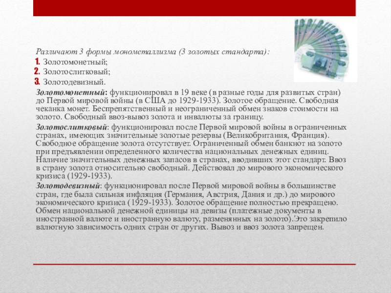 Слайд 19Различают 3 формы монометаллизма (3 золотых стандарта):