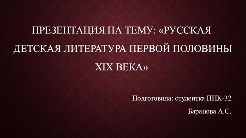 Слайд 1Презентация на тему: «РУССКАЯ ДЕТСКАЯ ЛИТЕРАТУРА ПЕРВОЙ ПОЛОВИНЫ