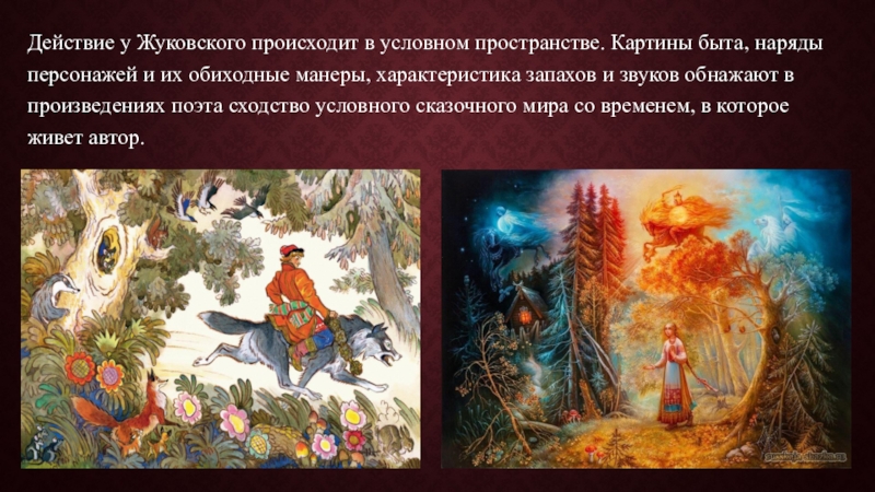 Слайд 25Действие у Жуковского происходит в условном пространстве. Картины быта, наряды персонажей