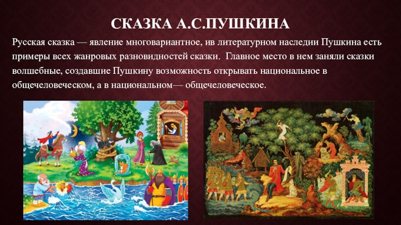 примеры всех жанровых разновидностей сказки. Главное место в нем заняли сказки волшебные, создавшие Пушкину возможность открывать национальное в общечеловеческом, а в национальном— общечеловеческое.