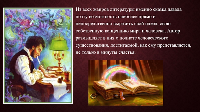 Слайд 15Из всех жанров литературы именно сказка давала поэту возможность наиболее прямо