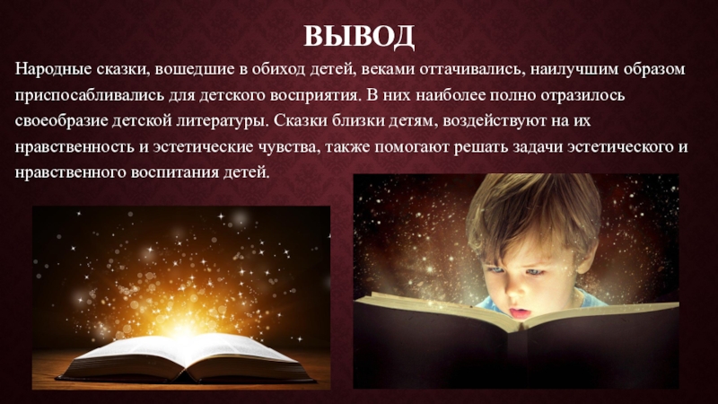 для детского восприятия. В них наиболее полно отразилось своеобразие детской литературы. Сказки близки детям, воздействуют на их нравственность и эстетические чувства, также помогают решать задачи эстетического и нравственного воспитания детей.