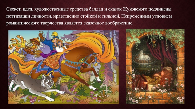 Слайд 22Сюжет, идея, художественные средства баллад и сказок Жуковского подчинены поэтизации личности,