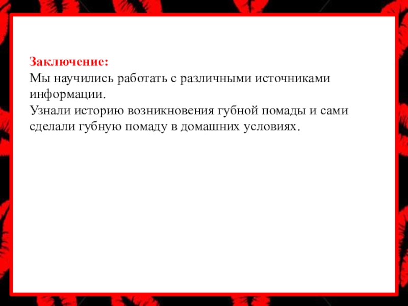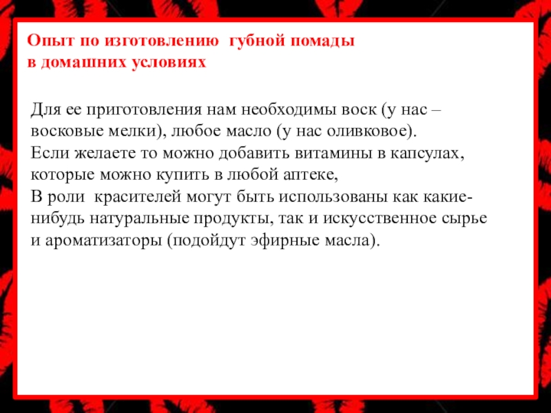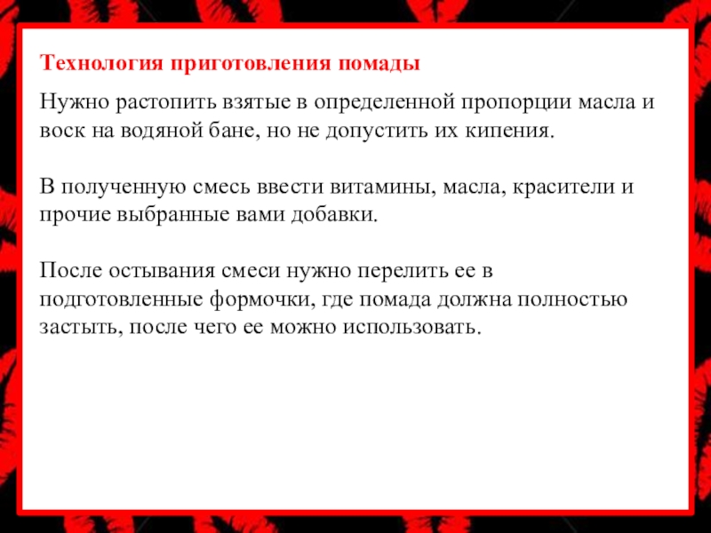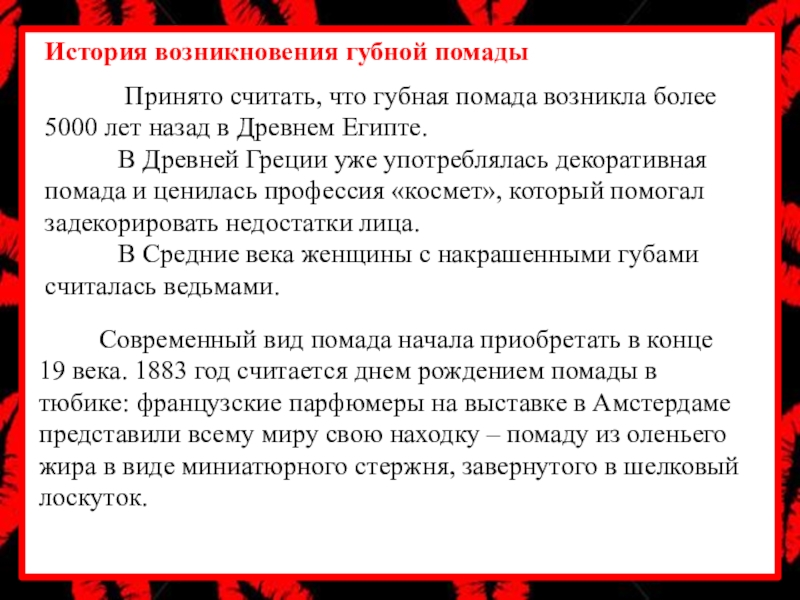 Современный вид помада начала приобретать в конце 19 века. 1883 год считается днем рождением помады в тюбике: французские парфюмеры на выставке в Амстердаме представили всему миру свою находку – помаду из оленьего жира в виде миниатюрного стержня, завернутого в шелковый лоскуток.