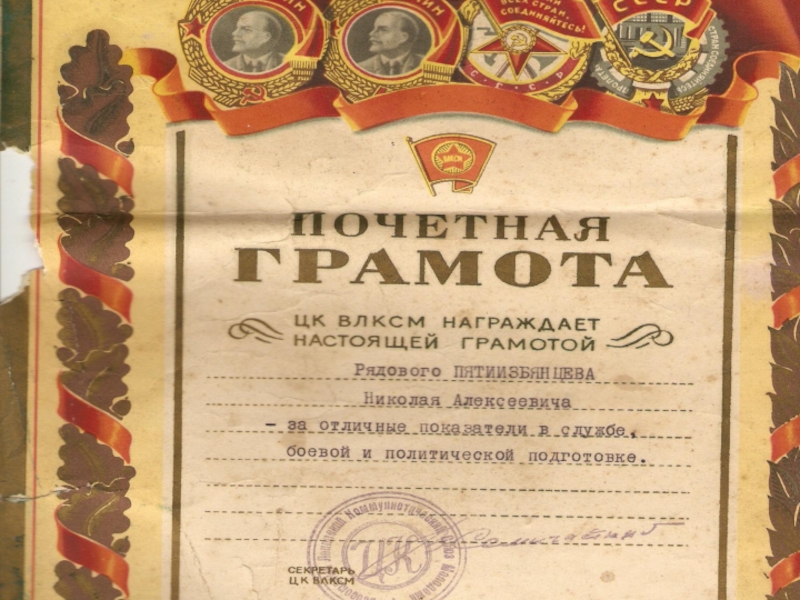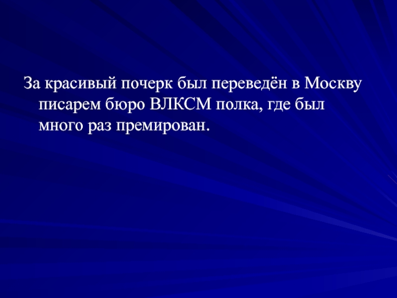 За красивый почерк был переведён в Москву писарем бюро ВЛКСМ полка,
