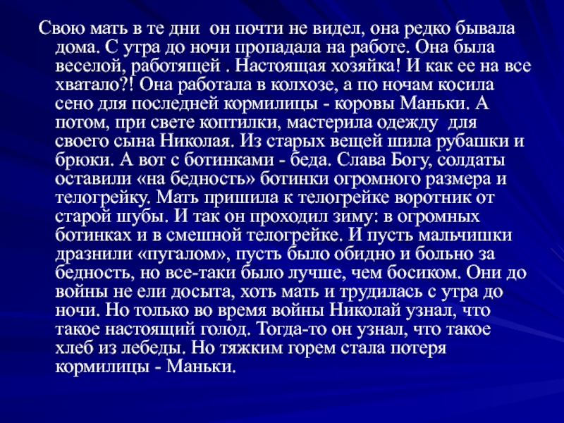 она редко бывала дома. С утра до ночи пропадала на работе. Она была веселой, работящей . Настоящая хозяйка! И как ее на все хватало?! Она работала в колхозе, а по ночам косила сено для последней кормилицы - коровы Маньки. А потом, при свете коптилки, мастерила одежду для своего сына Николая. Из старых вещей шила рубашки и брюки. А вот с ботинками - беда. Слава Богу, солдаты оставили «на бедность» ботинки огромного размера и телогрейку. Мать пришила к телогрейке воротник от старой шубы. И так он проходил зиму: в огромных ботинках и в смешной телогрейке. И пусть мальчишки дразнили «пугалом», пусть было обидно и больно за бедность, но все-таки было лучше, чем босиком. Они до войны не ели досыта, хоть мать и трудилась с утра до ночи. Но только во время войны Николай узнал, что такое настоящий голод. Тогда-то он узнал, что такое хлеб из лебеды. Но тяжким горем стала потеря кормилицы - Маньки.