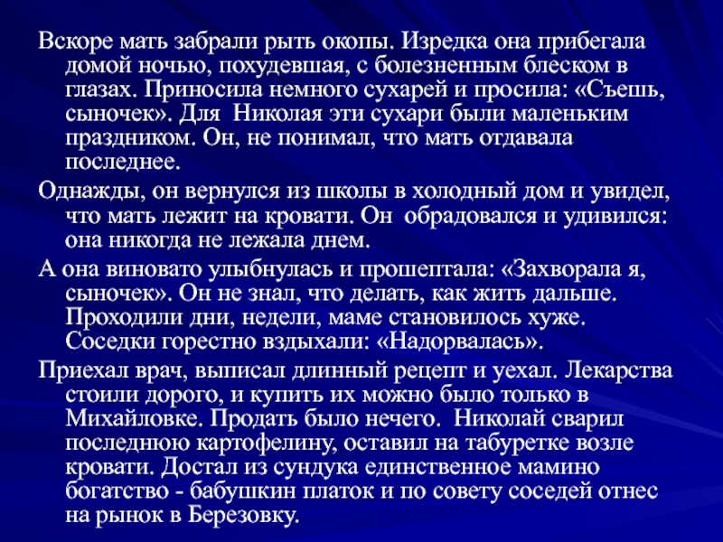 Приехал врач, выписал длинный рецепт и уехал. Лекарства стоили дорого, и купить их можно было только в Михайловке. Продать было нечего. Николай сварил последнюю картофелину, оставил на табуретке возле кровати. Достал из сундука единственное мамино богатство - бабушкин платок и по совету соседей отнес на рынок в Березовку.