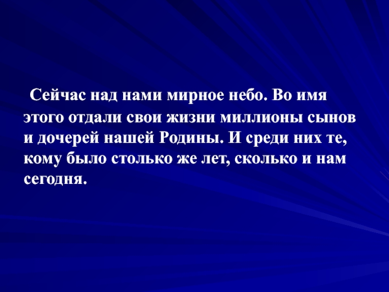 Слайд 25 Сейчас над нами мирное небо. Во имя этого отдали свои