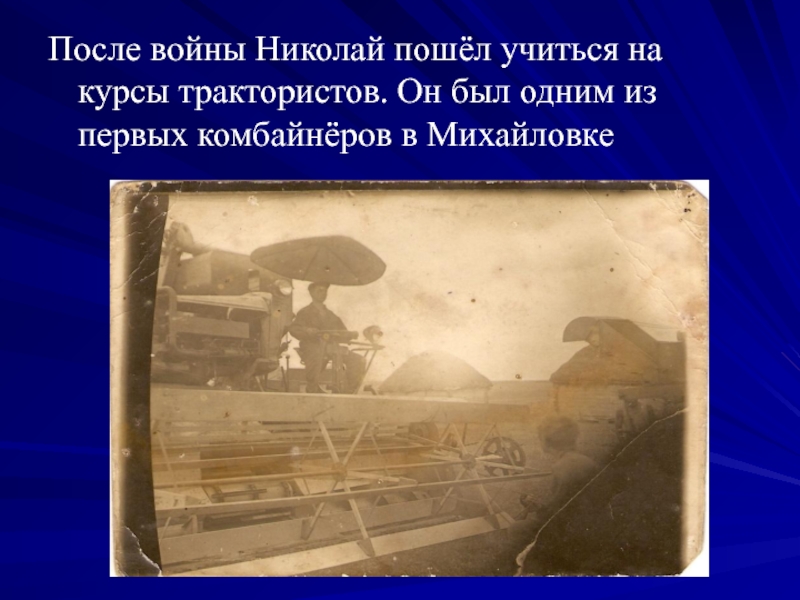 После войны Николай пошёл учиться на курсы трактористов. Он был одним