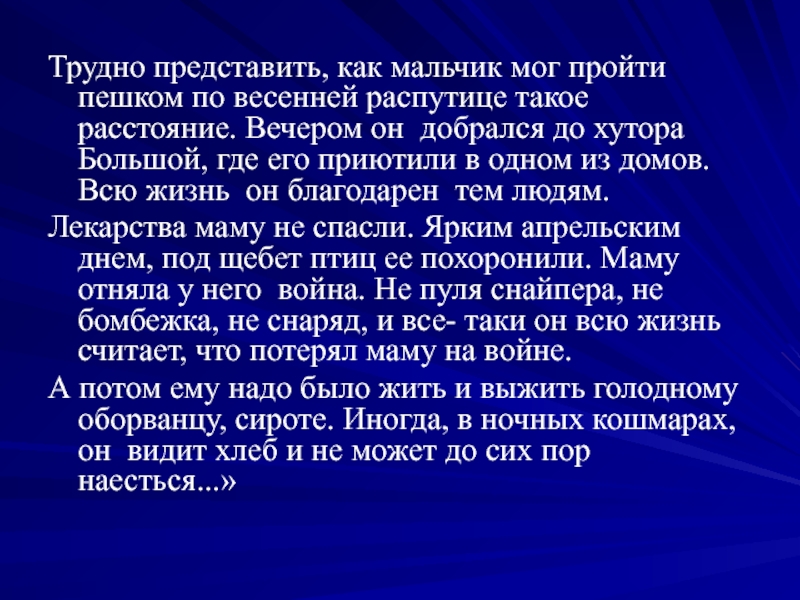 А потом ему надо было жить и выжить голодному оборванцу, сироте. Иногда, в ночных кошмарах,он видит хлеб и не может до сих пор наесться...»