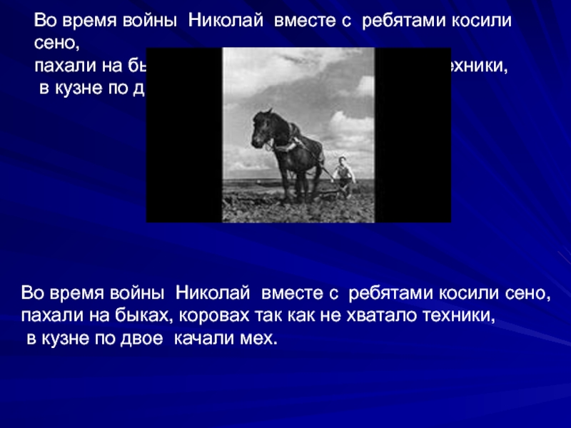 Слайд 14Во время войны Николай вместе с ребятами косили сено,