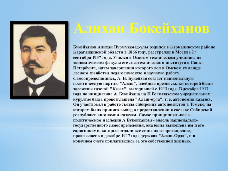 1866 году, расстрелян в Москве 27 сентября 1937 года. Учился в Омском техническом училище, на экономическом факультете лесотехнического института в Санкт-Петербурге, затем завершения которого вел в Омском училище лесного хозяйства педагогическую и научную работу. Самоопределившись, А. Н. Букейхан создает национальную политическую партию "Алаш", идейные предпосылки которой были заложены газетой "Казах", выходившей с 1913 года. В декабре 1917 года по инициативе А. Букейхана на П Всеказахском учредительном курултае была провозглашена "Алаш-орда", т. е. автономия казахов. Он участвовал в работе съезда сибирских автономистов в Томске, на котором было принято вывод о предоставлении в составе Сибирской республики автономии казахам. Самое принципиальное в политическом наследии А.Букейханова - мысль национально-государственного самоопределения, она была выношена им и его соратниками, которые отдали все силы на ее претворение, провозгласив в декабре 1917 года держава "Алаш-Орда", и в конечном счете поплатившись за это собственной жизнью.