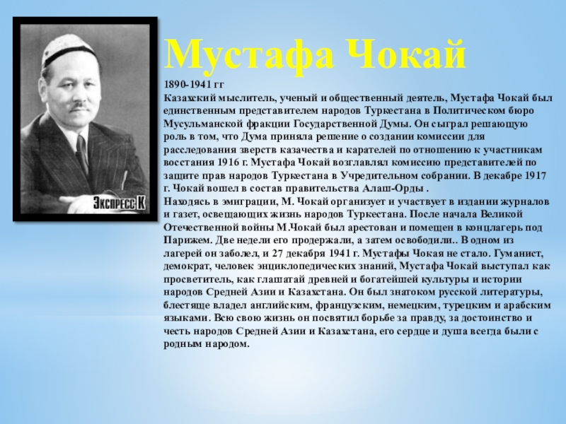 Казахский мыслитель, ученый и общественный деятель, Мустафа Чокай был